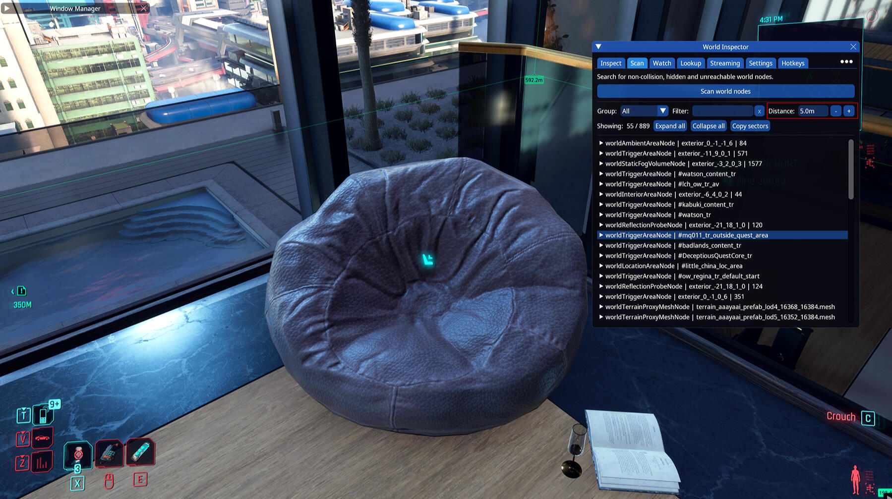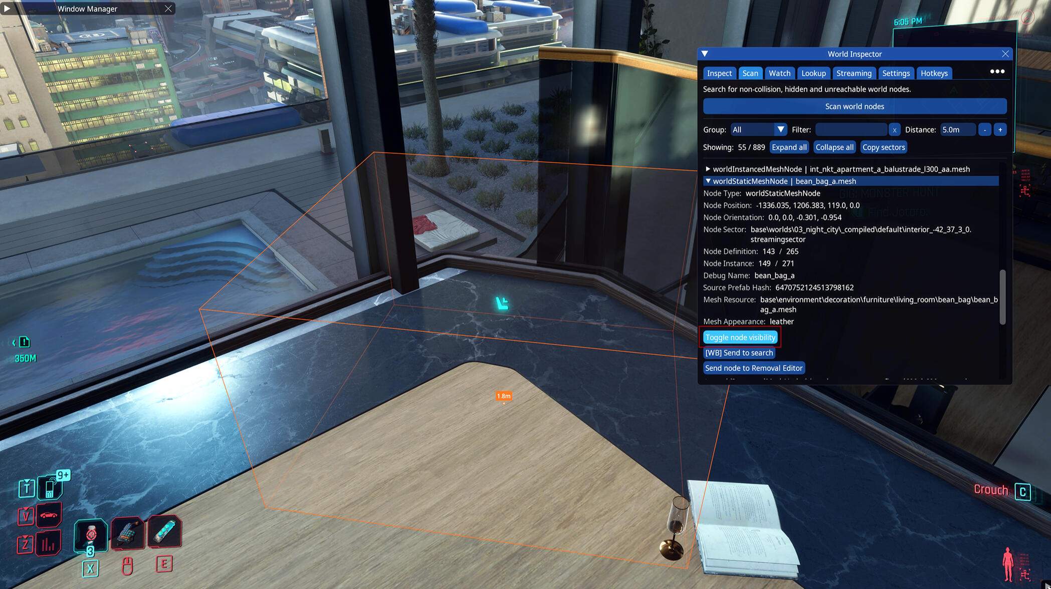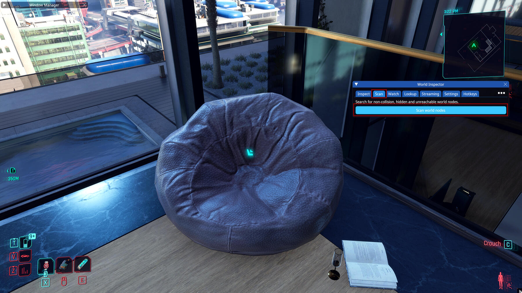 If you have installed Red Hot Tools the first thing we will do is start up Cyberpunk 2077 to get the info we need for the item we want!Go to the item you want to get and open your CET window. You may need to bind the World Inspector (which is part of Red Hot Tools) if you don't see it which you can do in your CET bar. If it's there already great! (Quick side note if you have like a ton of windows when you open CET because there are so many programs to add I can absolutely recommend the CET Window Manager Mod to create some order in the chaos.)Once you have the World Inspector open and the item you want in front of you go over to the Scan tab and press Scan world nodes. I'm going for the bean bag for this tutorial.