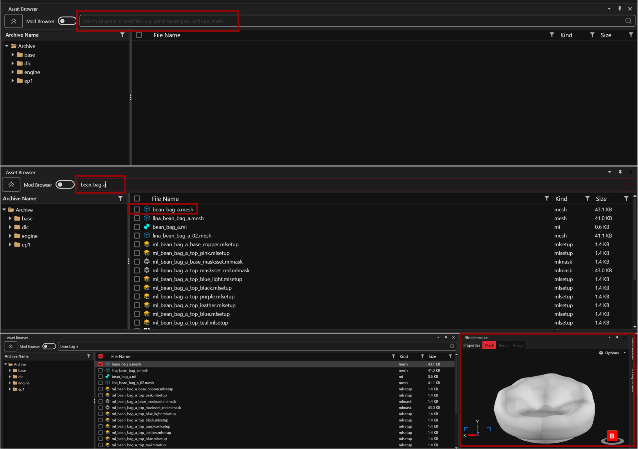 Open Wolvenkit. You can open your pose project if you want or make a new project for this item or an in general item pulling project that you can easily reuse in the future.When you're in your project locate the Asset Browser (its in the top middle for me, if you changed things around it maybe elsewhere). Type in the mesh name you just wrote down. A bunch of things will appear but find the one that matches the name exactly.If you have the File Information window you can click the mesh and see it in that window so you can be sure it's what you are looking for!