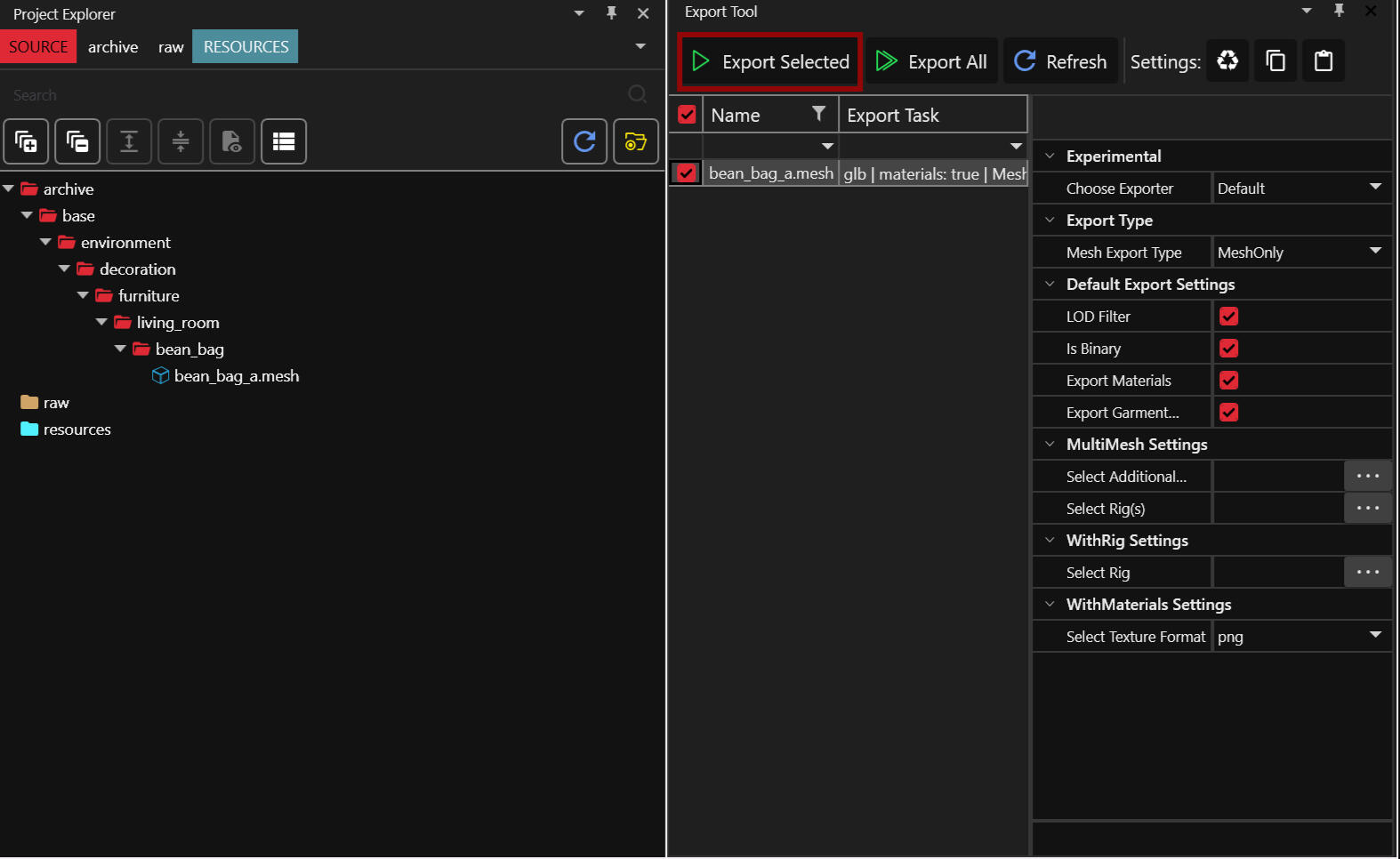 Double click the mesh so it gets added to your project. Locate your export tool and export the mesh. You can use the settings you see below but honestly the last clicked thing is garment support which is for clothes and I never changed it back so you could technically skip that one.Anyway we are done with Wolvenkit. Time to move on to Blender!