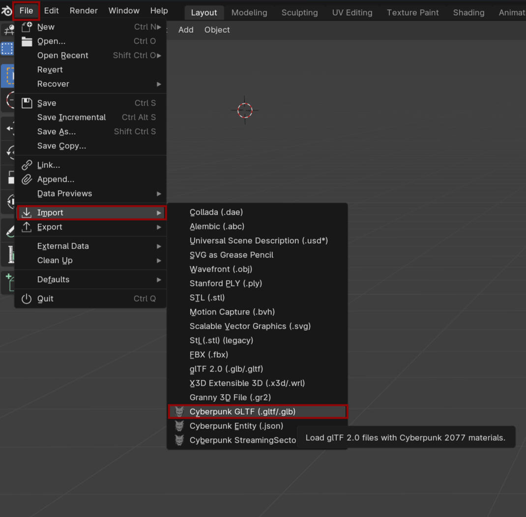 Open up whichever model you want to use with the item.Make sure the mode is set to Object Mode then go to File - Import - Cyberpunk GLTF. It should open a new window.