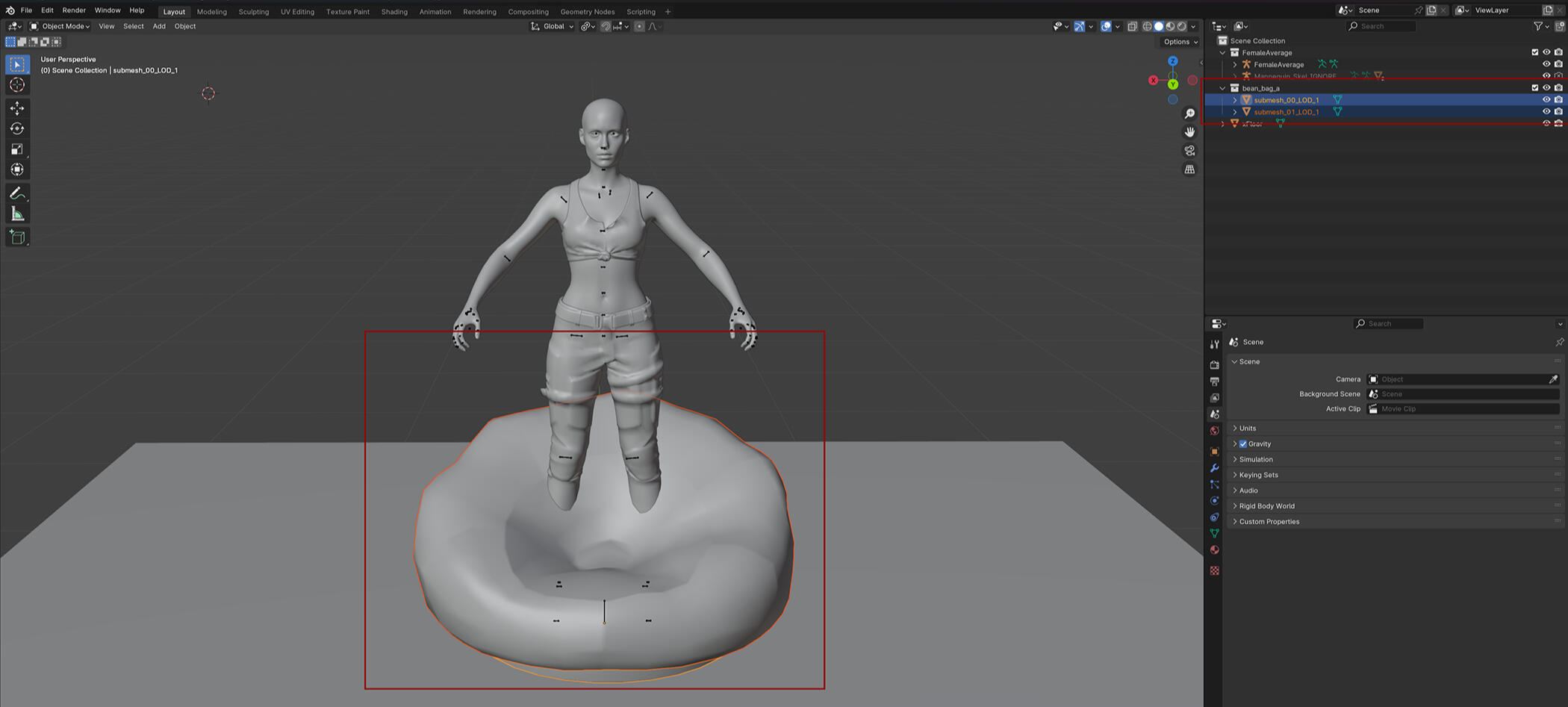 Now your item should be in Blender! There will be a new collection in the Scene Collection for it.If you are using the IK bones model you may notice that the bones have become smaller. The way to prevent this is to not import it directly into the model file but instead import it into an empty blender file then copy and pasting it from there into the model file. Everything else will still work the same and the IK bones won't be small and annoying to work with.You can move the item around in Object mode but not in Pose Mode so keep that in mind. Also another thing to note you see this bean bag has two submeshes, so it consists of two different parts. If I want to move it I need to select both submeshes or the item basically breaks. Which is fine in Blender since it won't show in game but can be annoying with some items. So watch those submeshes!
