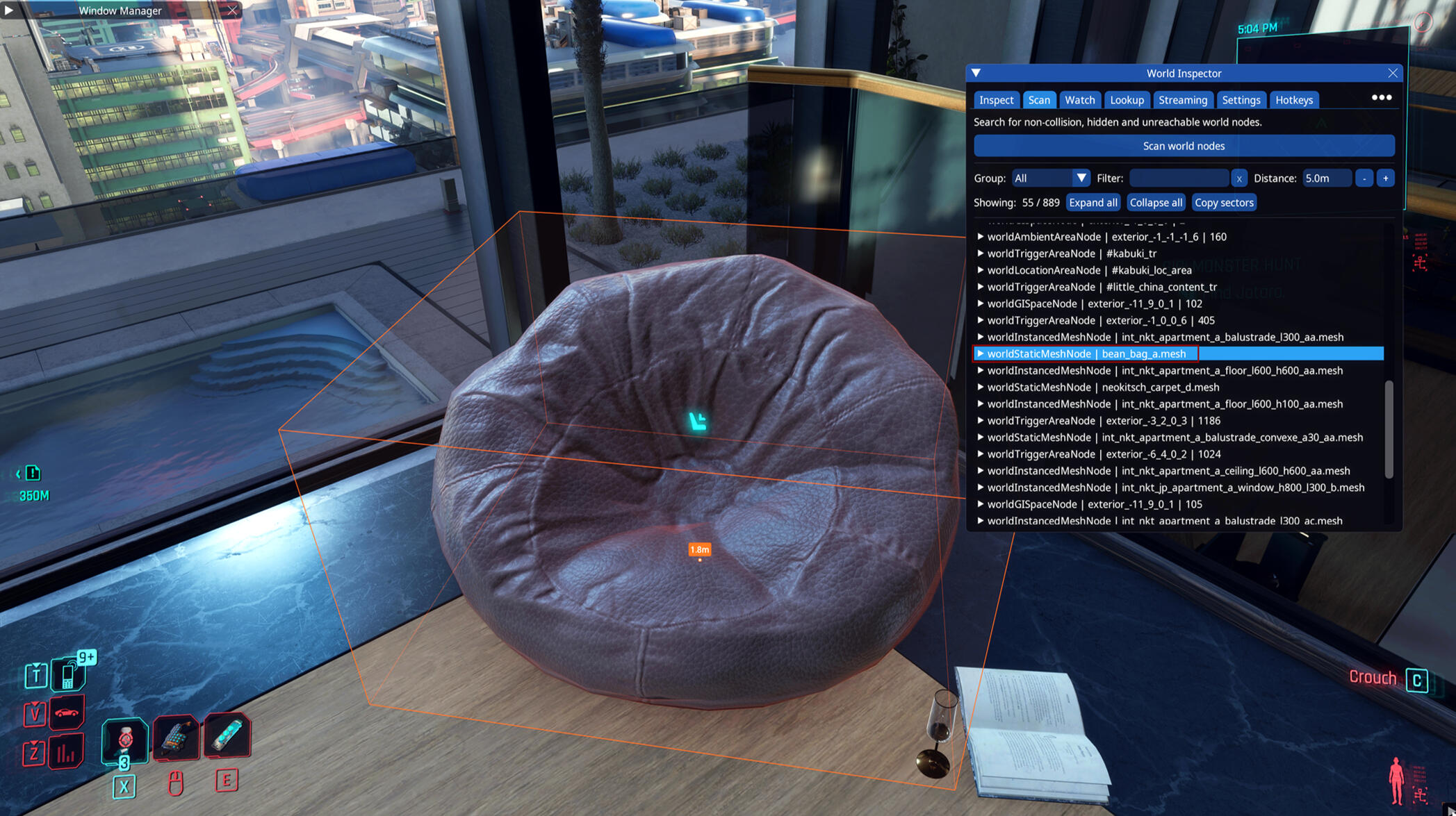 If you have installed Red Hot Tools the first thing we will do is start up Cyberpunk 2077 to get the info we need for the item we want!Go to the item you want to get and open your CET window. You may need to bind the World Inspector (which is part of Red Hot Tools) if you don't see it which you can do in your CET bar. If it's there already great! (Quick side note if you have like a ton of windows when you open CET because there are so many programs to add I can absolutely recommend the CET Window Manager Mod to create some order in the chaos.)Once you have the World Inspector open and the item you want in front of you go over to the Scan tab and press Scan world nodes. I'm going for the bean bag for this tutorial.