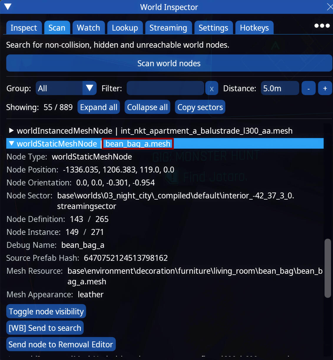 Okay back to serious stuff. So what we need is the mesh name. It's already in the main line without opening it up. bean_bag_a.mesh is technically all I need. This is easy to remember but you see above it that there is a long named mesh. Just write the name down so you can be sure you get the right thing in Wolvenkit.When you have the name noted down close the game! We're done here.