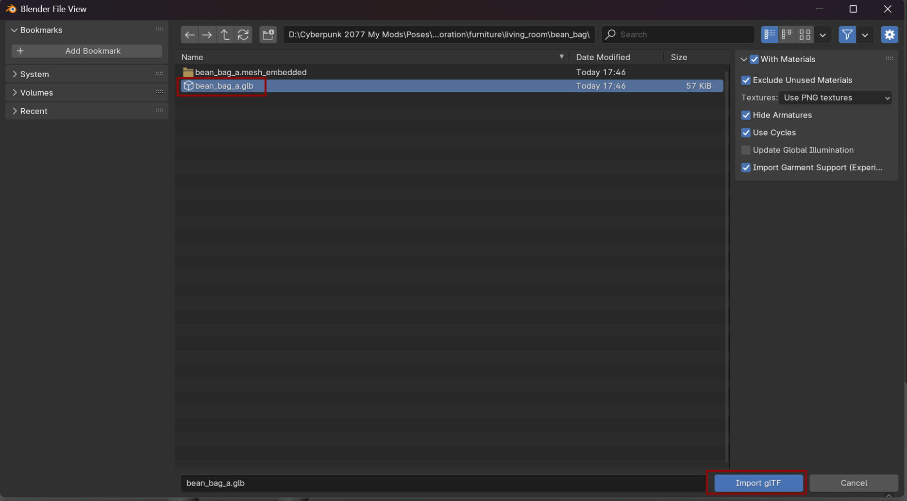 Open up whichever model you want to use with the item.Make sure the mode is set to Object Mode then go to File - Import - Cyberpunk GLTF. It should open a new window.